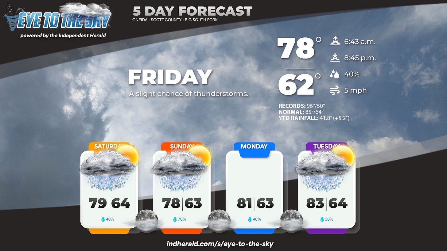 🌦 Weather: It’s going to be a nice weekend. Although there will be daily rain chances (especially Sunday), temperatures will only be in the upper 70s to near 80° each day. Check out our daily Eye to the Sky updates on our Facebook page — published each morning at 7 a.m. on the dot.