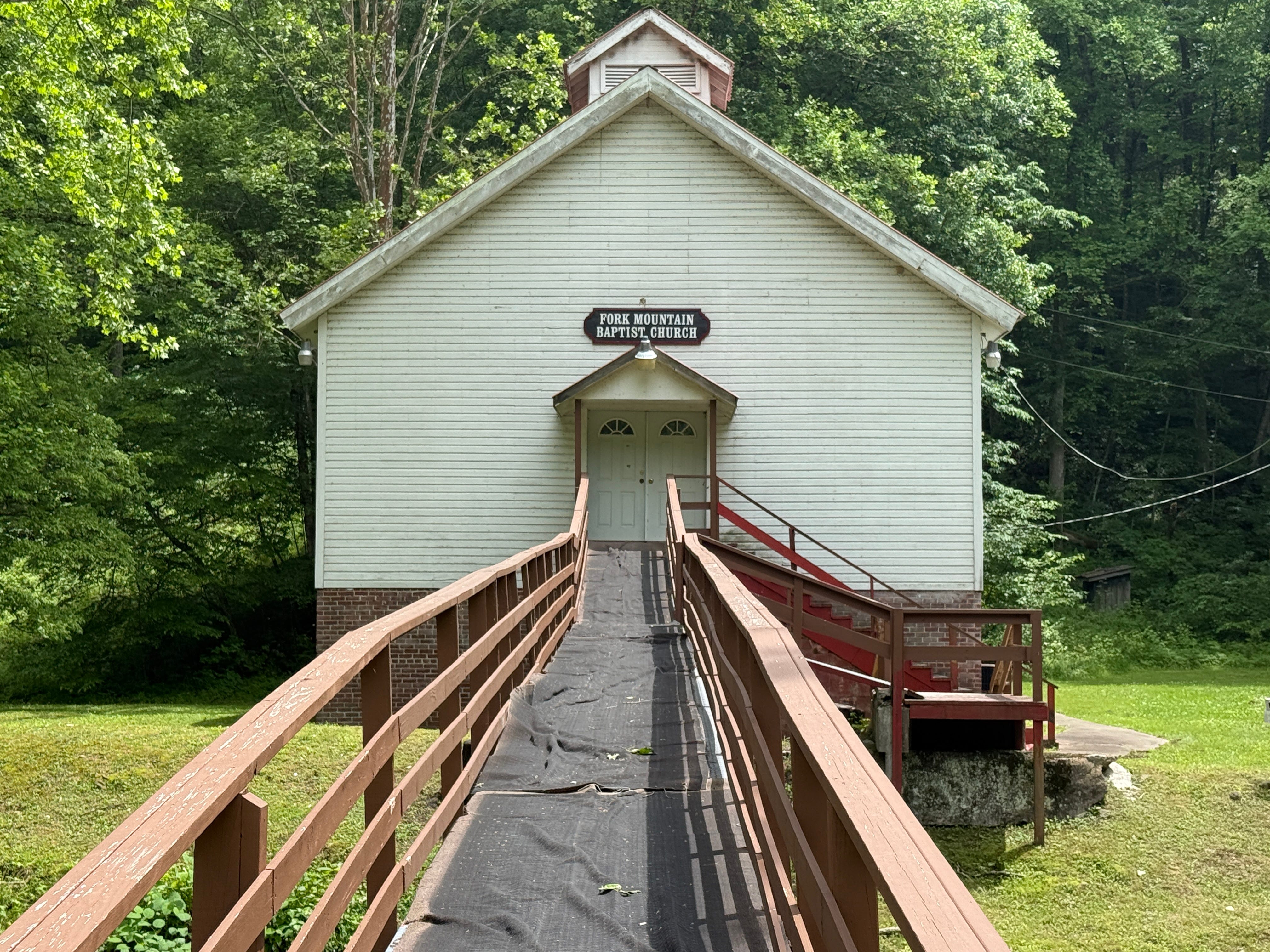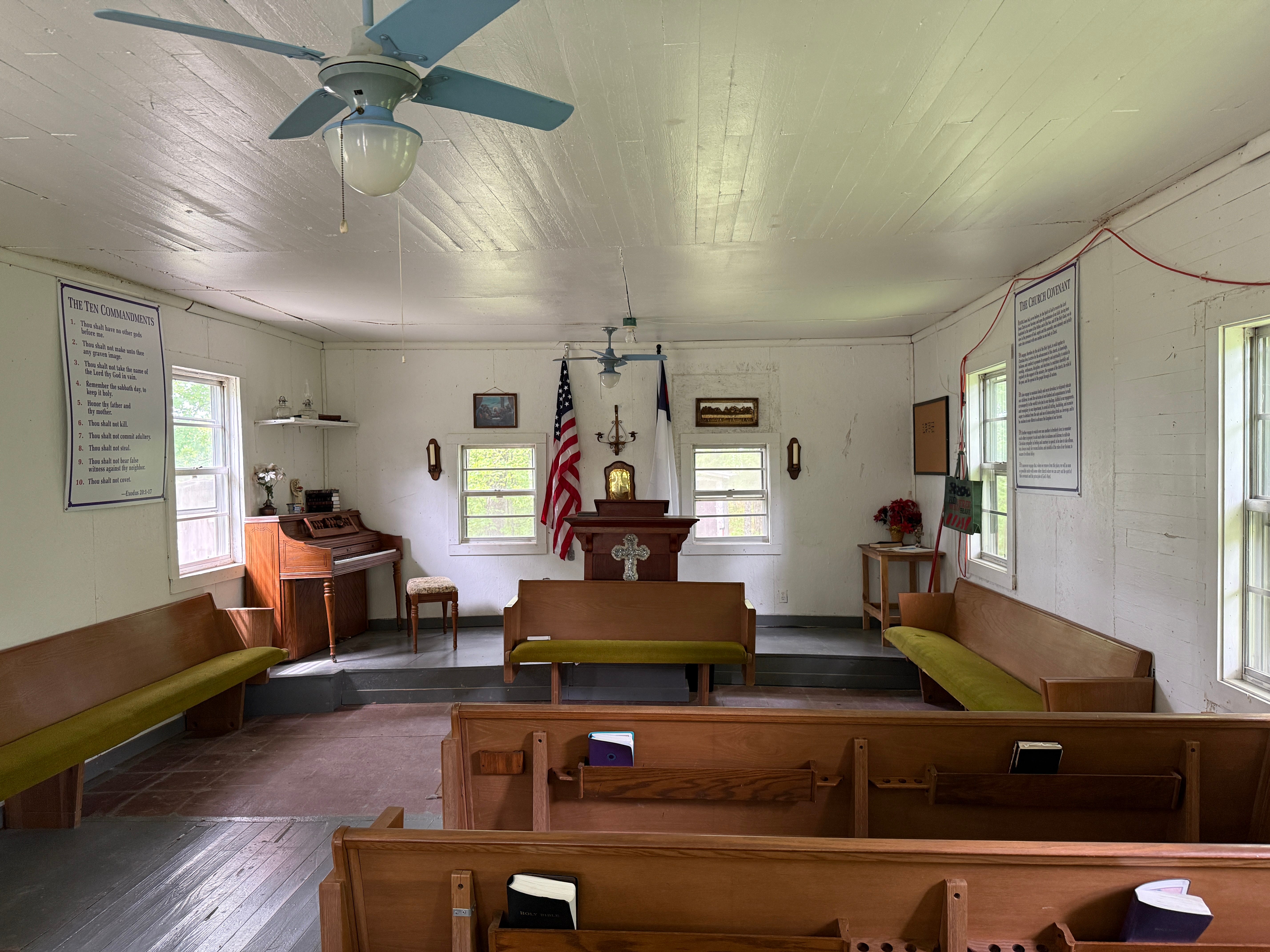 Seeing this small mountain church house is well worth the drive up the mountain. It’s an incredibly peaceful and beautiful setting on the mountain top. The church house was built in 1935. Prior to that, this was a school. Sadly, services are no longer held at Red Oak; as of this writing, the grounds haven’t been mowed in 2025. Still, the door to the church is unlocked, and you can slip inside and experience was houses of worship were like in these small mountain communities in days gone by.