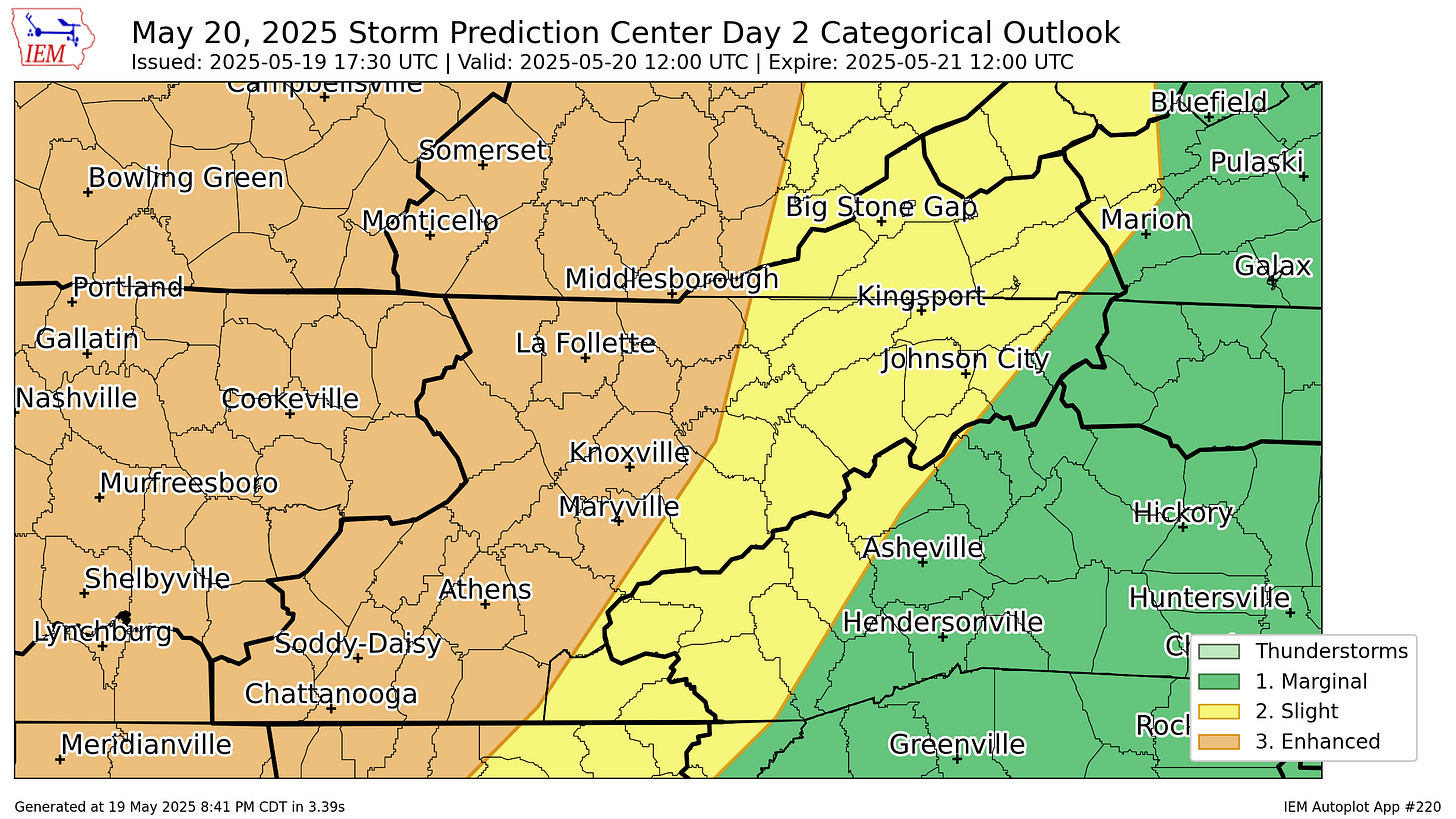 An “enhanced risk” is the third level on the SPC’s five-step scale for measuring the threat of severe weather. Enhanced risk outlooks are relatively rare for the northern plateau region, but this will be the second “enhanced risk” day in the past five days. The region was also under an “enhanced risk” for severe weather on Friday, the evening a fatal tornado ripped through the Kentucky towns of Somerset and London.