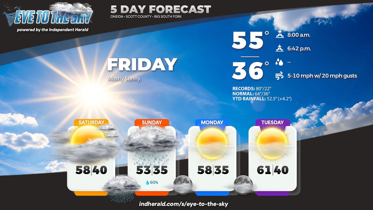 Good Thursday evening! This is The Weekender, a final look at this week’s news from the Independent Herald. The Daybreaker (Monday) and The Weekender (Thursday evening) are our two news-first newsletters. We publish several other newsletters throughout the week, as well as our regular E-Edition on Thursday and our Varsity E-Edition on Sunday (during sports season). If you’d like to adjust your subscription to include (or exclude) any of these newsletters, do so here. If you haven’t subscribed, please consider doing so!