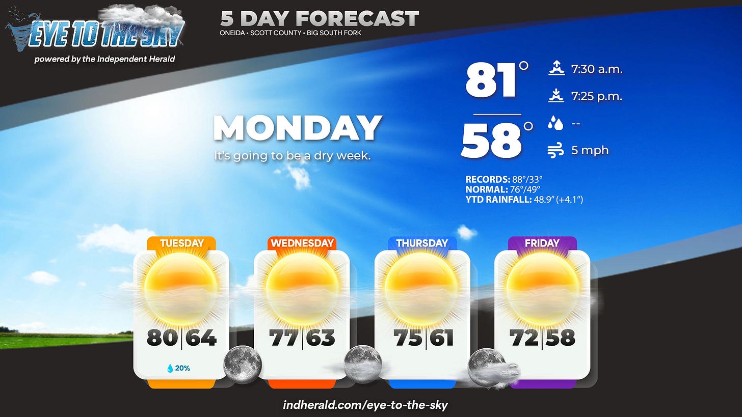 ☀️ Weather: A dry, warm week is in store for us, with temperatures starting in the 80s and settling back into the mid 70s by the end of the week. Check out our daily Eye to the Sky updates on our Facebook page — published each morning at 7 a.m. on the dot — or always available at indherald.com.