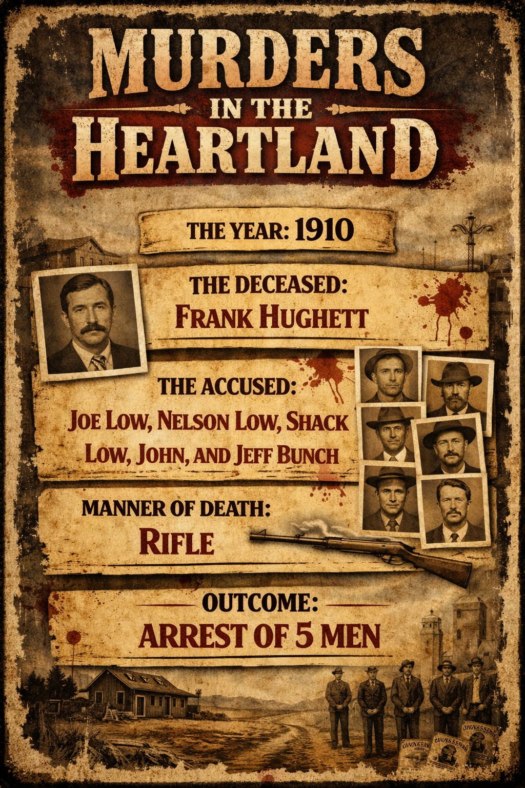 Another person in the camp saw a man run from the bushes after the shots. Bloodhounds were brought in from Somerset, Kentucky, and they followed the track with the patient, unhurried certainty that bloodhounds have – noses to the earth, reading the story the ground was telling – until the trail led to arrests. Five men: Joe Lowe, Nelson Lowe, Shack Lowe, John Bunch, and Jeff Bunch. The Lowe name was right there in the middle of it, as Hughett might have known it would be. Riley Lowe’s brother and kin, settling the account that had been opened in the winter.