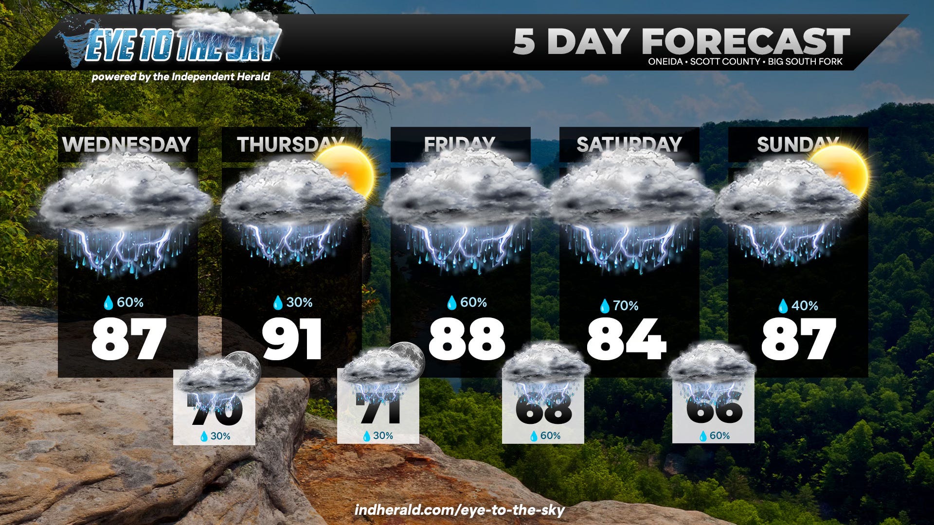 Details: There’s a 60% chance of thunderstorms today with temperatures in the upper 80s. The primary window for thunderstorms will be 2 p.m. to 4 p.m. this afternoon. We’ll see the thunderstorm threat back off somewhat tonight and tomorrow, though the rain threat won’t completely go away. Tomorrow will be hot, with temperatures in the 90s. Then rain becomes likely again for Friday and Saturday.