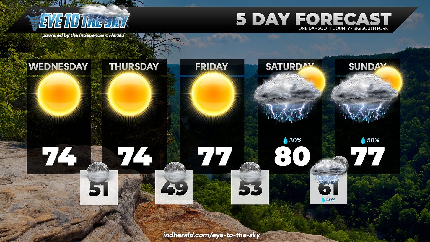 Details: We’ll see sunny skies today and a high of only about 74° before we drop to near 50° tonight. Some outlying areas could make a run at the 40s tonight and again tomorrow night. Tomorrow will be a carbon-copy of today, then we’ll gradually start to warm up as we head into the weekend.