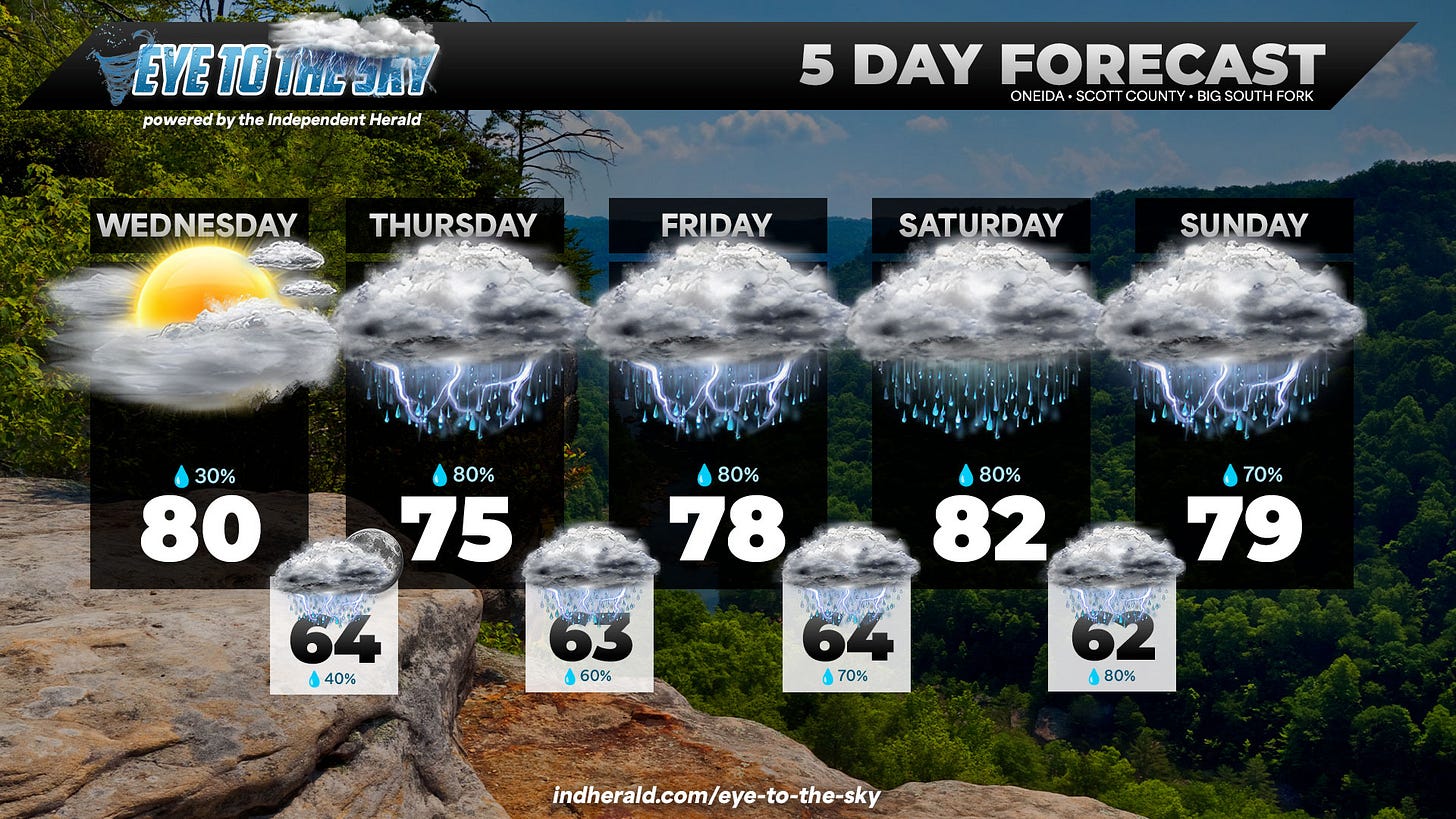 Details: We’ll top out around 80° today with partly sunny skies and a 30% chance of rain after 4 p.m. There will be rain to our west this morning, but it’ll peter out before it gets here. Around 4 p.m. or so, though, we should start to see thunderstorms develop along the Cumberland Plateau. Chances of rain will remain relatively low, but it looks like we’ll see a large cluster of rain and storms develop across eastern Kentucky this evening. And it will only be a matter of time before some of that activity makes it this far south. Thursday may be calm most of the day, but showers and thunderstorms are probable as the day progresses. Rain will then be likely each day through Monday, although it won’t rain all the time and it’s too early to tell when the wettest periods will be. Around an inch or so of rain is possible through the weekend but totals could greatly vary depending on where thunderstorms set up. Heavy rain could occur at some point early next week; right now the best chance looks like Monday night into Tuesday, though the timing could shift. For now it’s just something to keep an eye on.