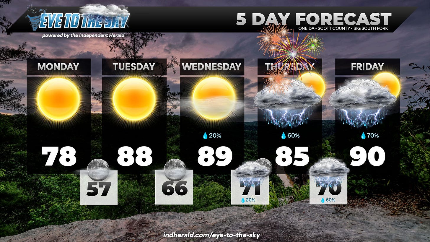 Details: We’ll top out around 78° today with lots of sunshine. The dry weather will continue tomorrow, but it’ll be much warmer, as we’re once again pushing 90°. The heat will continue into Wednesday, with a slight chance of an afternoon thunderstorm. There are much better chances of rain Thursday and Friday, as thunderstorms become likely both days. Thursday’s storms will be diurnally driven, and influenced by an influx of moisture from the Gulf of Mexico and some weak energy in the upper layers of the atmosphere. Rain showers and thunderstorms will continue to be likely Friday and Saturday. The good news is that Thursday won’t be a washout, by any means. We should be dry for the New River Run and the Firemen’s Breakfast at the Town of Huntsville’s annual Firemen’s Fourth Festival. There will be a better chance of thunderstorms during the early afternoon hours, continuing until around sunset or so, but these thunderstorms should be primarily hit or miss. Storms will probably be more widespread in coverage Friday and Saturday.