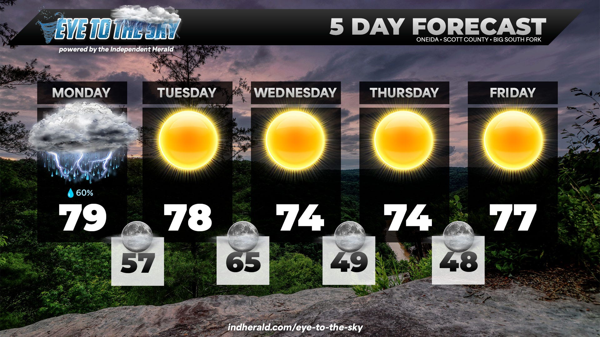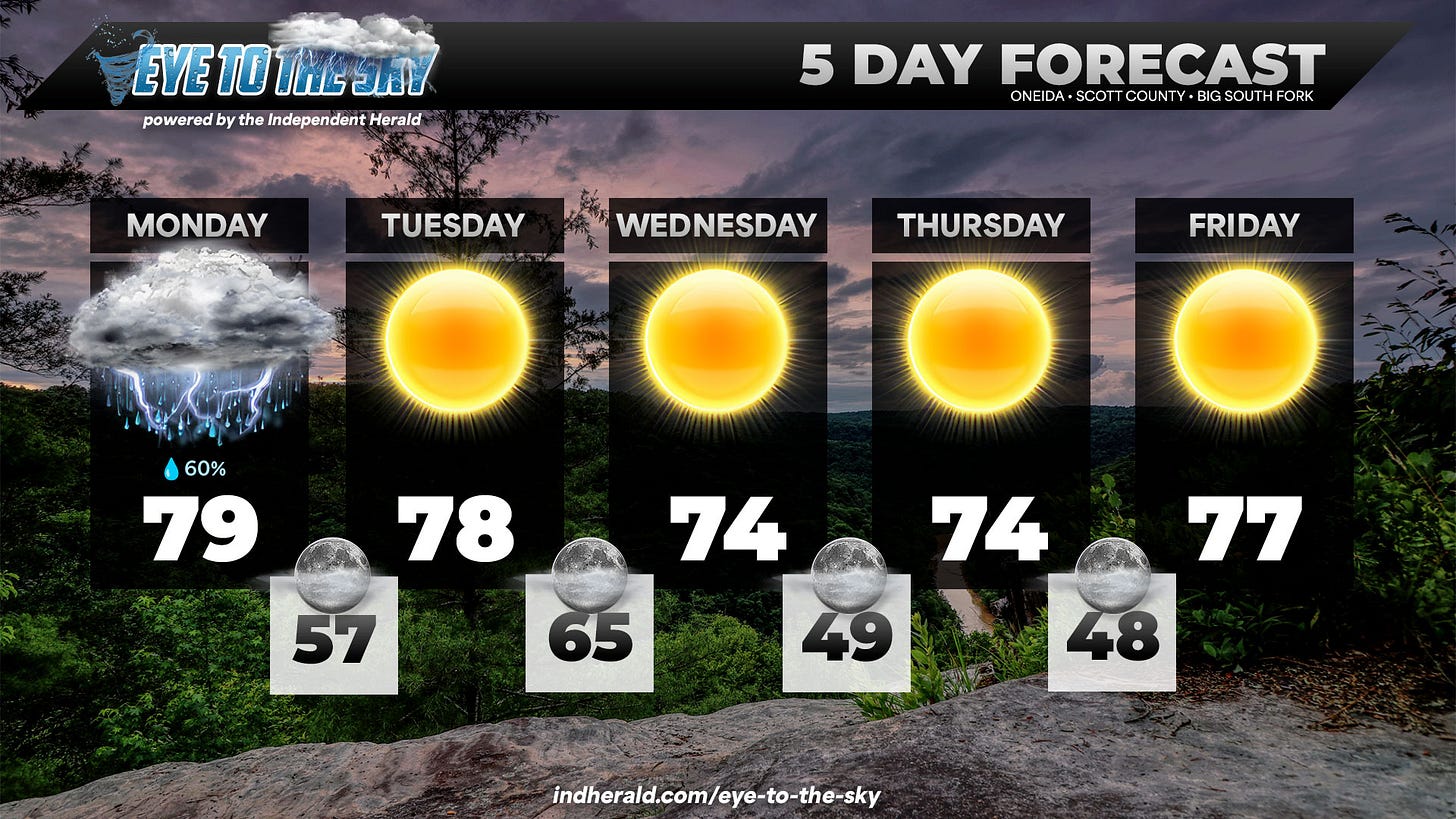 Details: There’s a 60% chance of showers and thunderstorms today, with a high near 80°. However, it’s not clear how much rain we’ll actually see today. The bulk of the precipitation should be exiting the region around daybreak. We will see some redevelopment of isolated showers and thunderstorms today, and most folks will probably see persistent clouds and drizzle. But, again, the bulk of the rain seems likely to exit early. An absolutely beautiful week is on tap, with sunny skies and temperatures only in the mid 70s Tuesday - Friday.
