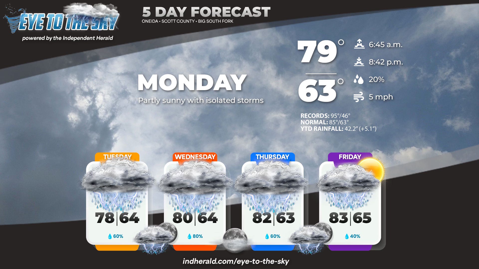 🌤️ Weather: There’s only a slight chance of an isolated thunderstorm this afternoon. Otherwise, temperatures will continue to be several degrees cooler than normal for this time of year, in the upper 70s. Rain will be likely each day for much of the rest of the week. Check out our daily Eye to the Sky updates on our Facebook page — published each morning at 7 a.m. on the dot — or always available at indherald.com.