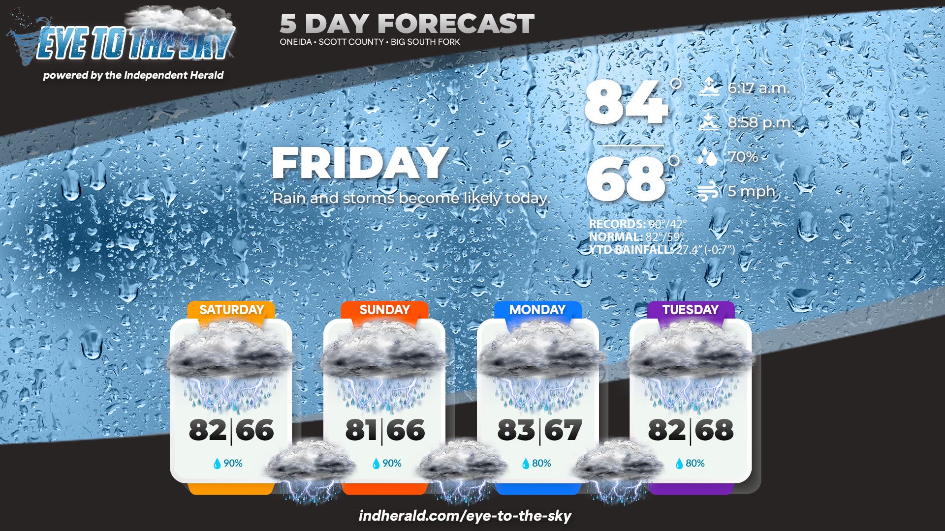 ⛈️ Weather: Rain and thunderstorms will become likely this afternoon and remain likely each day into at least the middle of next week. Heavy downpours are possible in some areas, which could lead to some isolated flooding concerns. Temperatures will be very muggy over the next few days, with highs in the mid 80s and lows in the upper 60s. Check out our daily Eye to the Sky updates on our Facebook page — published each morning at 7 a.m. on the dot.
