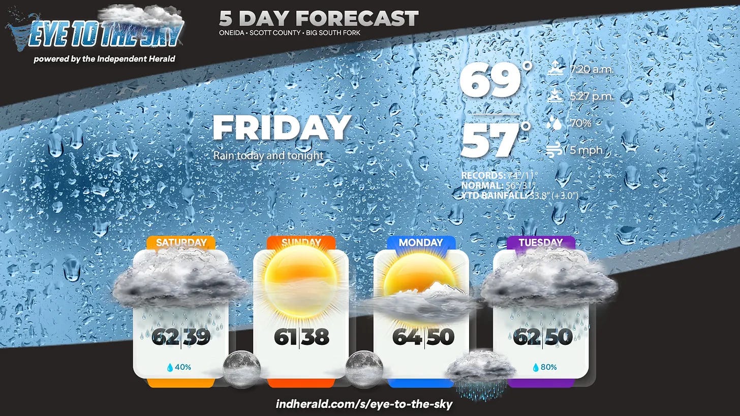 🌧️ Weather: It’ll be a wet start to the weekend, with rain chances increasing to 100% tonight, and shower activity lingering into Saturday morning before things improve. Above-normal temperatures will continue throughout the weekend, with afternoon highs in the 60s. Check out our daily Eye to the Sky updates on our Facebook page — published each morning at 7 a.m. on the dot.