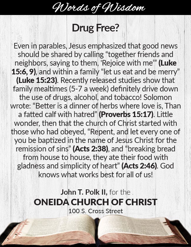 Each week, Preacher Johnny Polk and the Oneida Church of Christ present Words of Wisdom, short devotionals that are archived on our website. Here is the current Words of Wisdom. (Sponsored content.)