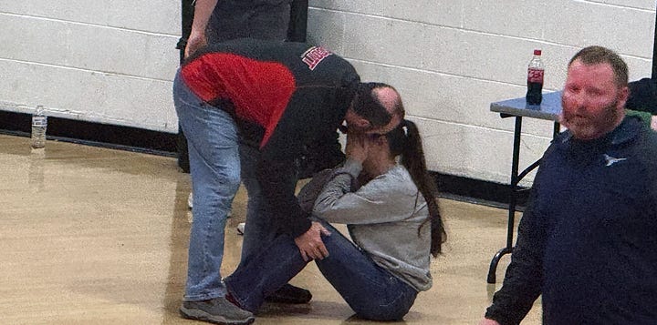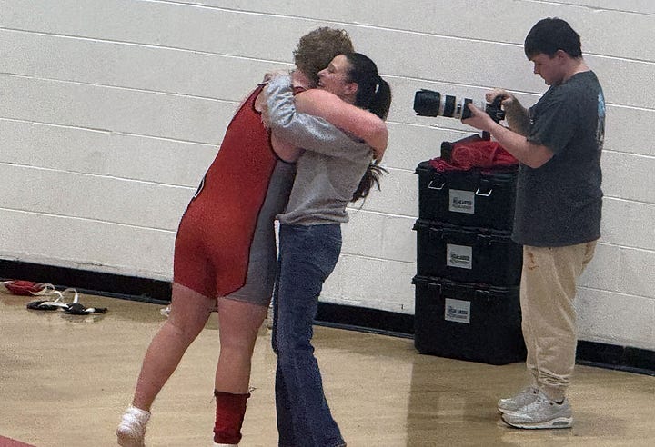 Video: Above, Coach Jason Jeffers reacts after his team wins the district duals championship. Below, Mason Lewallen and the Highlanders react after Lewallen secures the district title with a pin.