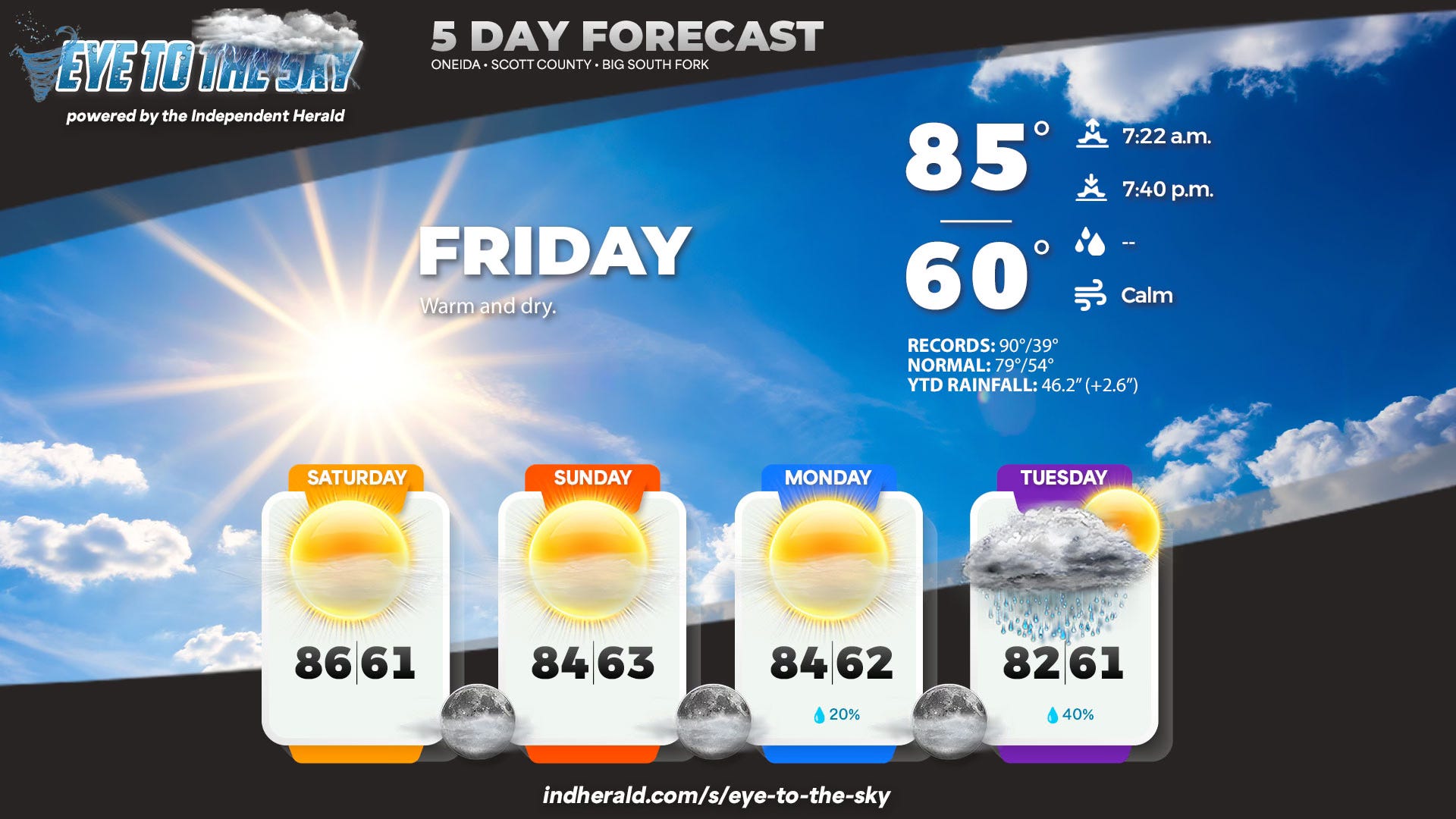 ☀️ Weather: Hot and dry will be the theme of this weekend, with daily temperatures in the mid 80s and lots of sunshine. Check out our daily Eye to the Sky updates on our Facebook page — published each morning at 7 a.m. on the dot.