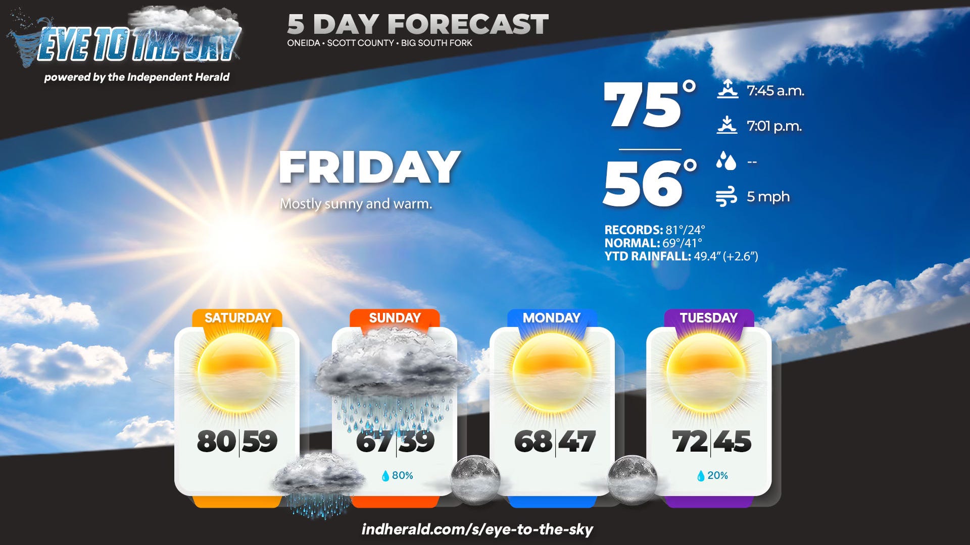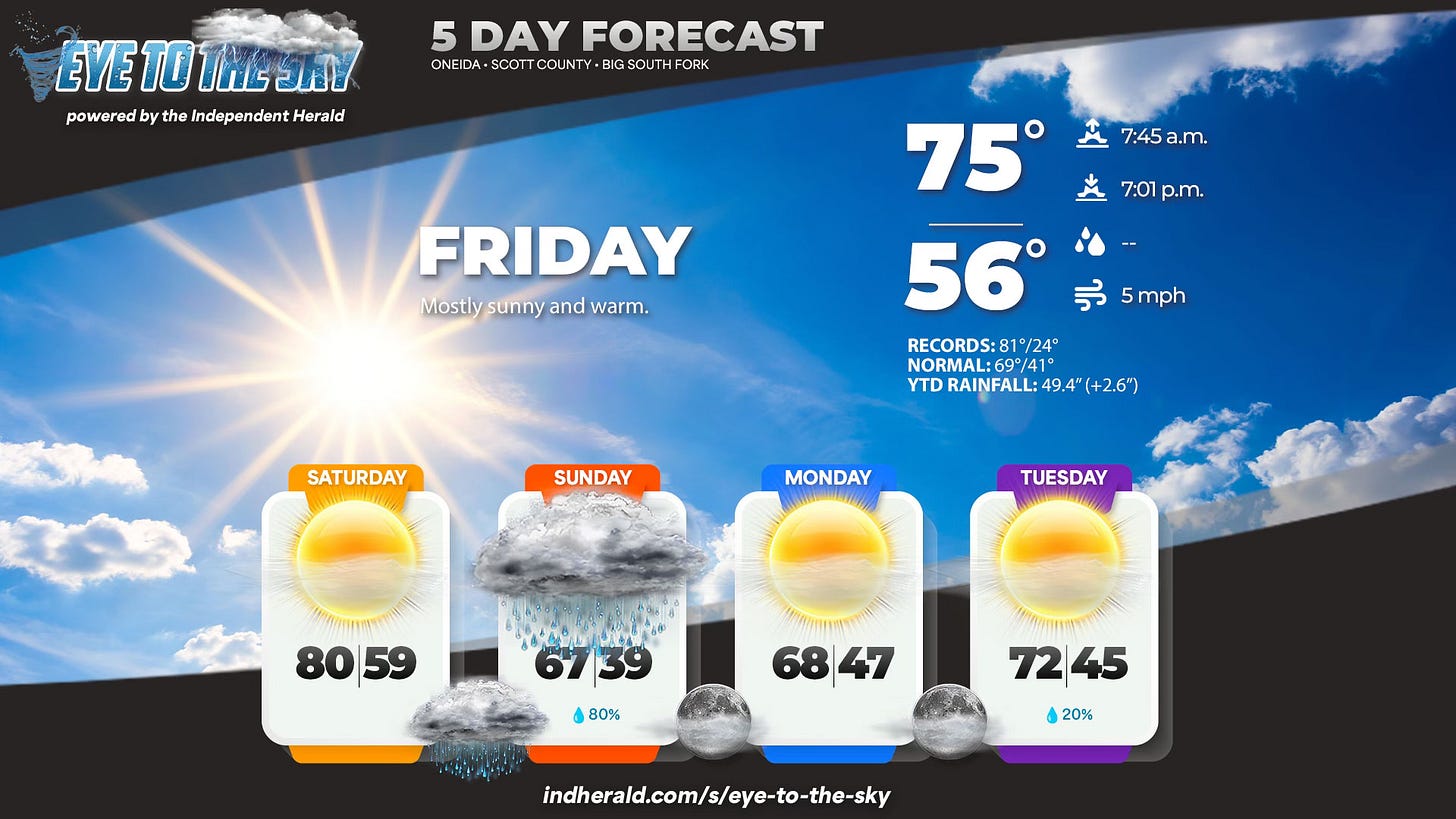 ☀️ Weather: The weekend will start off beautiful, but a cold front will bring rain to the region Saturday night and Sunday. Check out our daily Eye to the Sky updates on our Facebook page — published each morning at 7 a.m. on the dot.