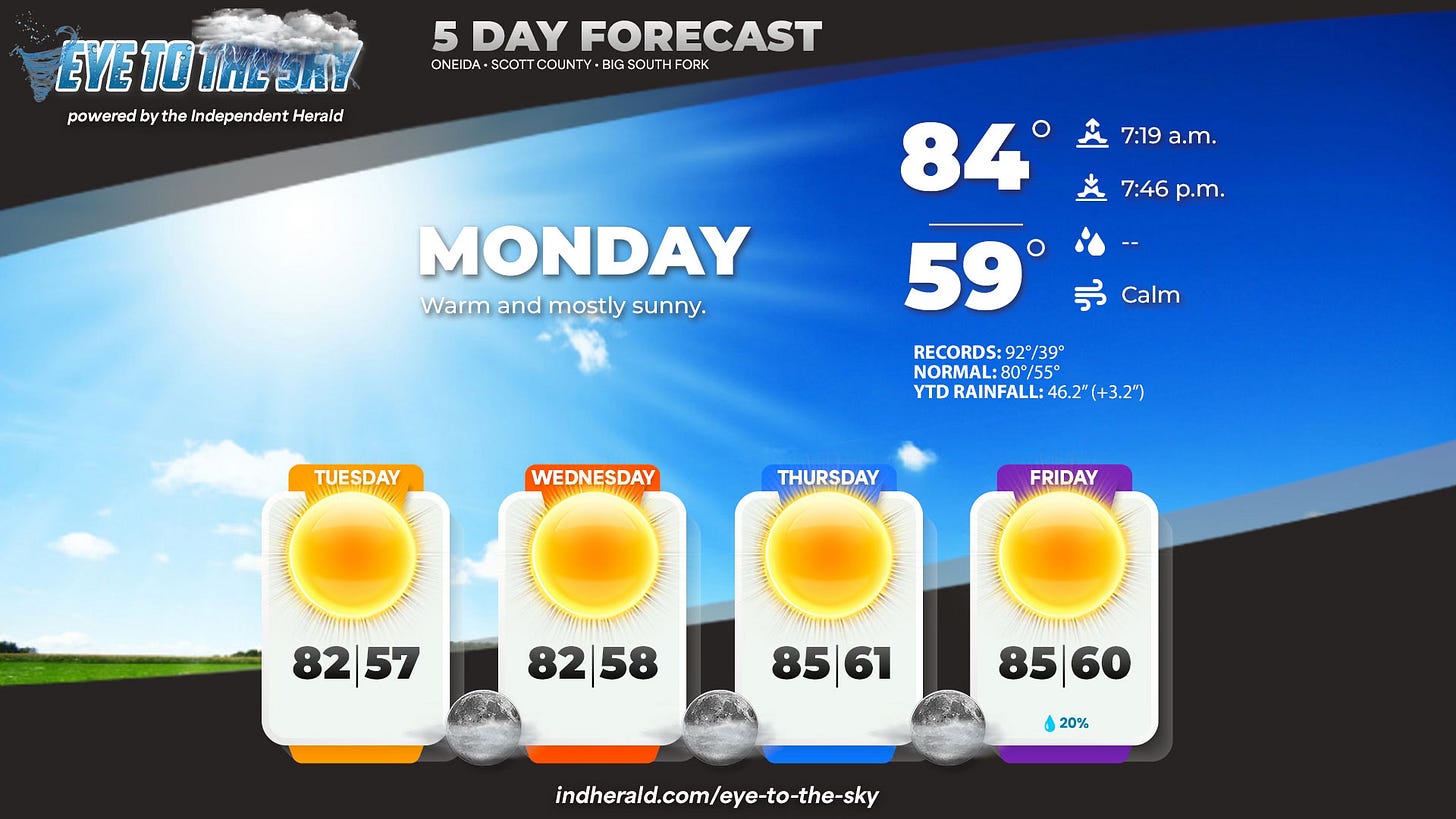 ☀️ Weather: Hot, dry weather will continue throughout this week, with temperatures generally in the mid 80s and lots of sunshine. We’ll see rain chances begin to creep back into the forecast this weekend. Check out our daily Eye to the Sky updates on our Facebook page — published each morning at 7 a.m. on the dot — or always available at indherald.com.