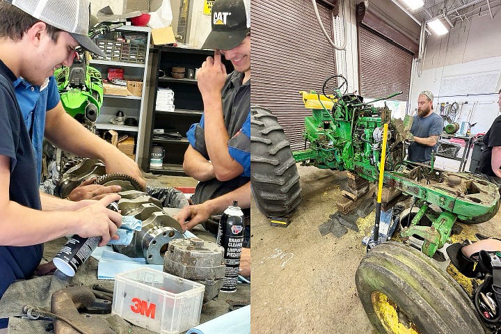 “There was very little green paint on it, there was moss growing on the exhaust pipe,” instructor Gabe Kennedy recalled. “We did a complete engine overhaul with a new head, new pistons, all of that. We rebuilt the hydraulic system. We sanded it down and repainted it. We put a new cam in it. It’s safe to say that we have more than 1,000 hours of work in it.”