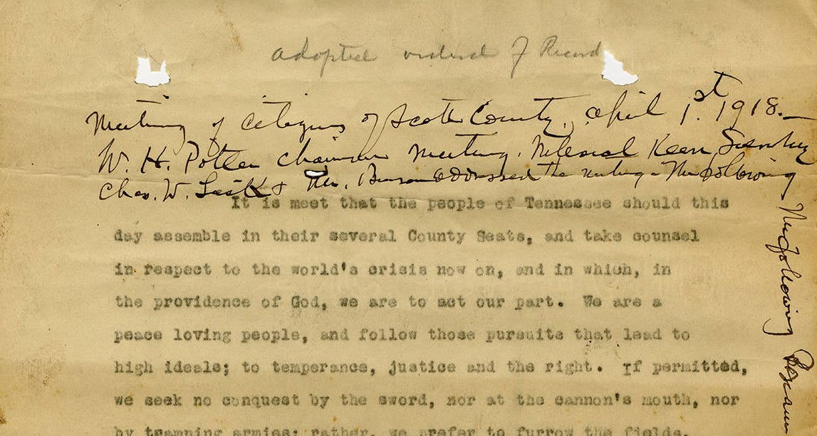 It is meet that the people of Tennessee should this day assemble in their several County Seats, and take counsel in respect to the world’s crisis now on, and in which, in the providence of God, we are to act our part. We are a peace loving people, and follow those pursuits that lead to high ideals; to temperance, justice and the right. If permitted, we seek no conquest by the sword, nor at the cannon’s mouth, nor by tramping armies; rather, we prefer to furrow the fields, to grow and gather in the fruitage of the soil; to burrow the mountains and compel nature to surrender the gifts of her store house. We love industrial development that gives employment to labor rather than blood-stained battle fields.
