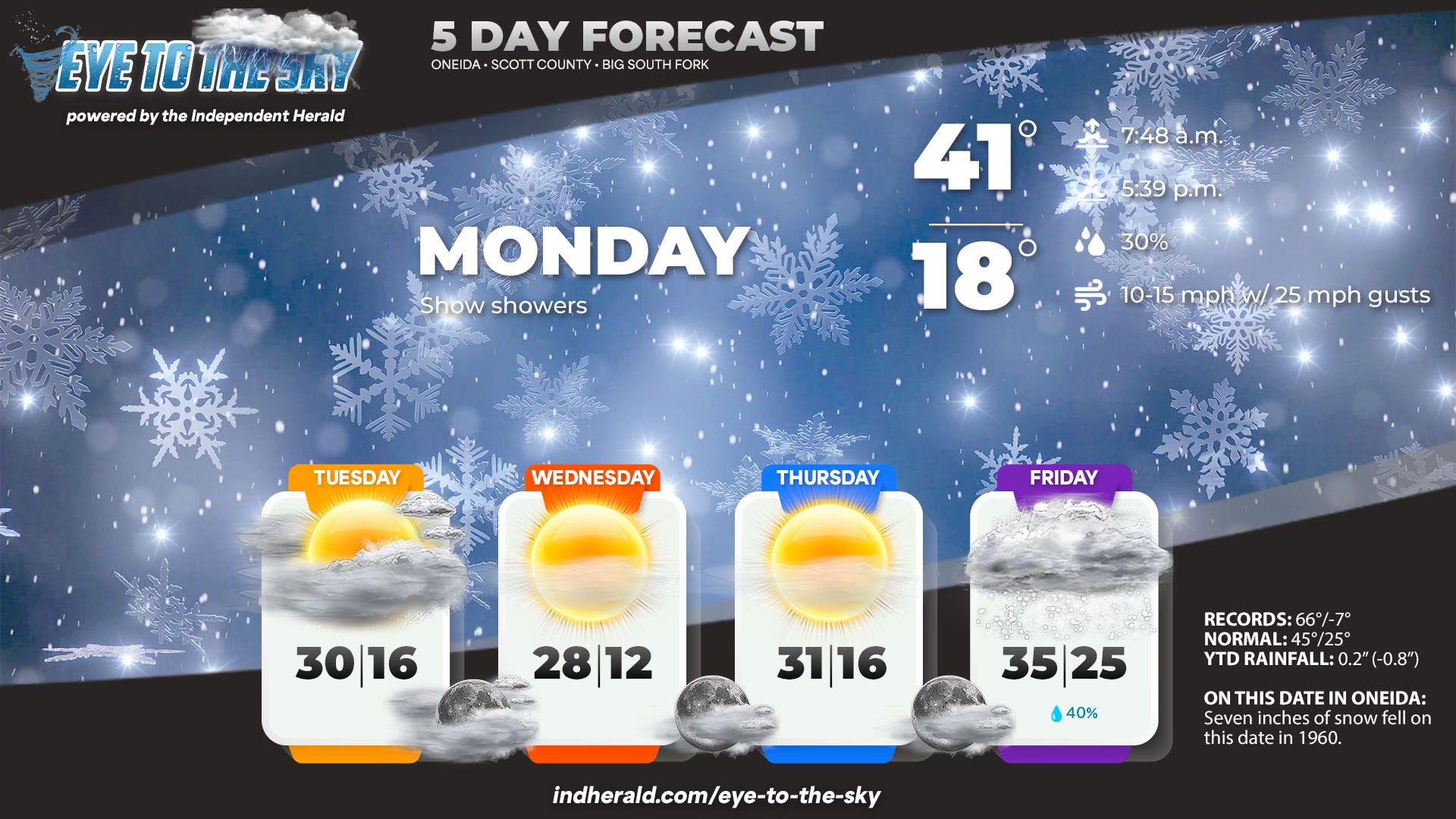 Details: Temperatures will be dropping today, with gusty winds and a chance of snow. We'll probably still be in the 40s at 7 a.m., but temperatures will drop steadily this morning, and we'll be in the 20s by lunchtime. Temperatures will then hover in the 20s this afternoon. There's a chance of light snow showers today, but very little accumulation is expected. In fact, the National Weather Service has decreased the forecast from a 60% chance of snow to a 30% chance of snow, which seems reasonable. High-resolution models are far less bullish on snow chances today than the lower-resolution global models, and keep the bulk of the wrap-around snow showers limited to eastern Kentucky. That said, this is a pretty solid setup for northwest flow snow showers that often aren't picked up on by models. Some areas might squeeze out an inch of snow, but it seems more likely that most of us will be limited to no more than a dusting. Some minor travel inconveniences are possible if and wherever the heavier snow showers occur, but widespread road hazards aren't currently expected. Otherwise we'll drop into the teens tonight. Sunshine will begin to return tomorrow, and we'll experience sunny days Wednesday and Thursday with continued cold temperatures that feature daytime highs in the upper 20s to around 30°, and nighttime lows in the teens.