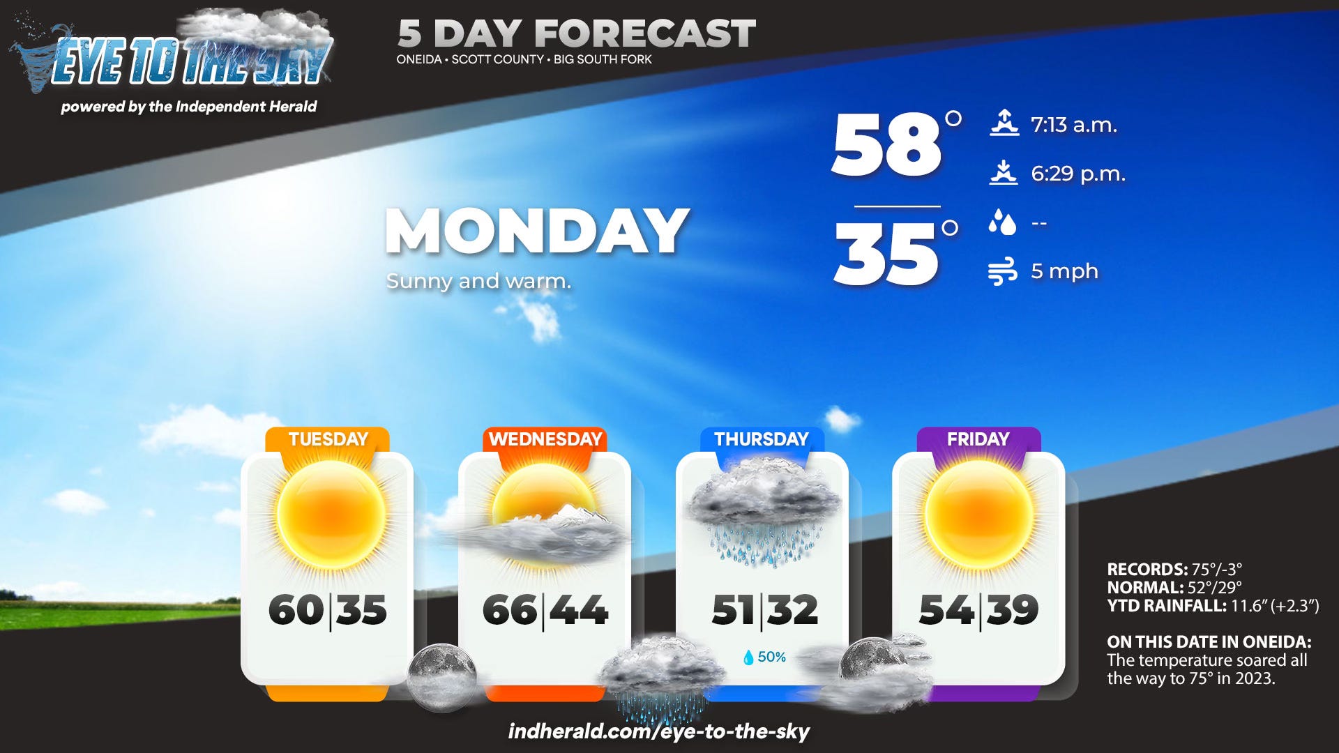ALMANAC: Sunrise/Sunset: 7:13/6:29 • Normals: 52°/29° • Records: 75° (2023), -3° (1963) • Year-To-Date Rainfall: 11.6" (Normal: 9.3").
