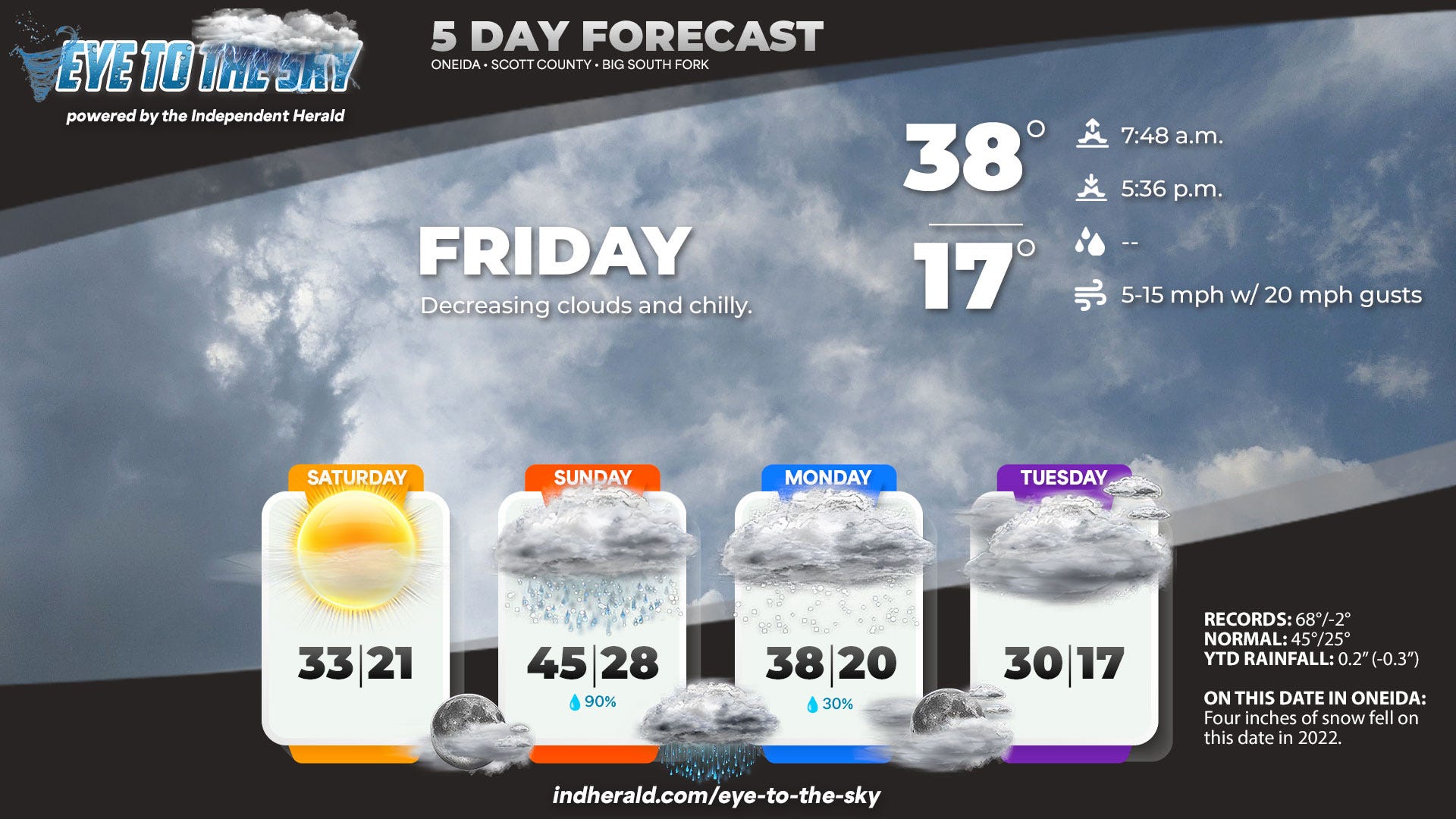 Details: After a cloudy start, we'll see clearing skies today. But we'll also see wind gusts to 20 mph, which is going to make the 38° high this afternoon seem a little colder. We'll drop into the teens tonight, then struggle to get above freezing with sunny skies tomorrow. That will set the stage for a winter storm that will impact our area Sunday and Sunday night, although it currently looks inconsequential for our area. Here's the breakdown: