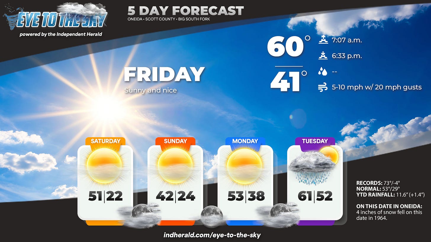 DETAILS: It’ll be sunny today with a high of around 60°. If there’s a downside, it’ll also be breezy, with wind gusts to 20 mph. But it’s hard to complain about that!