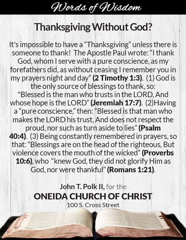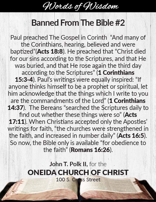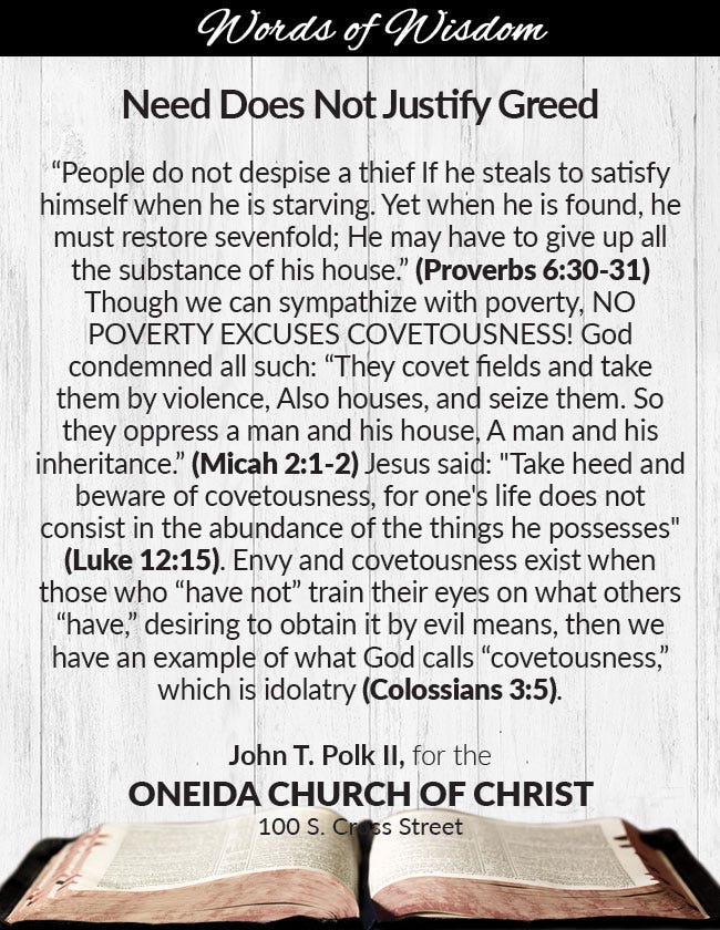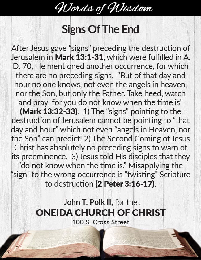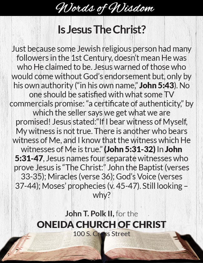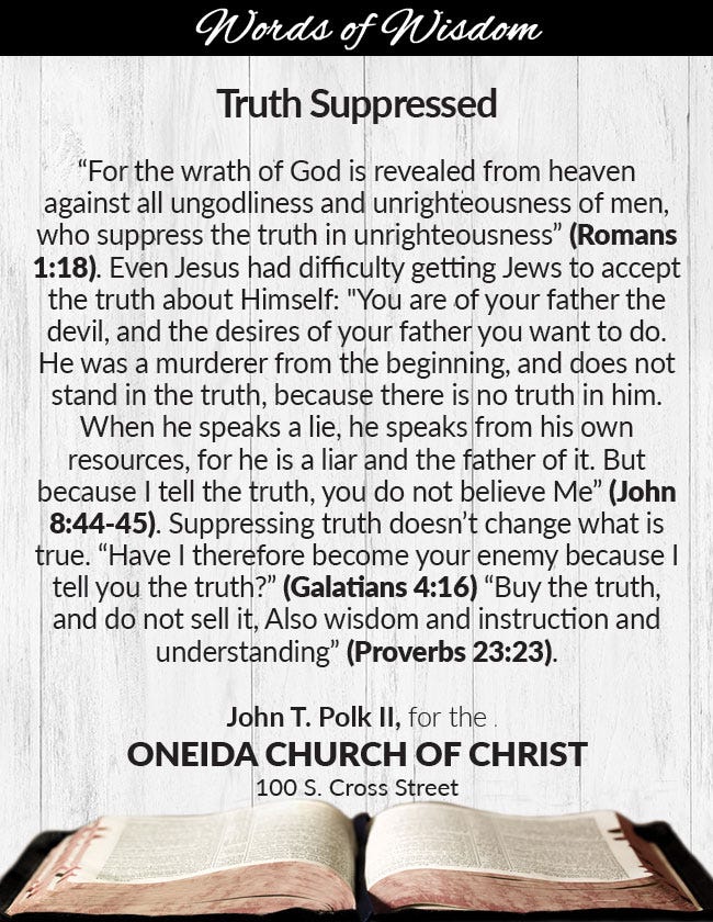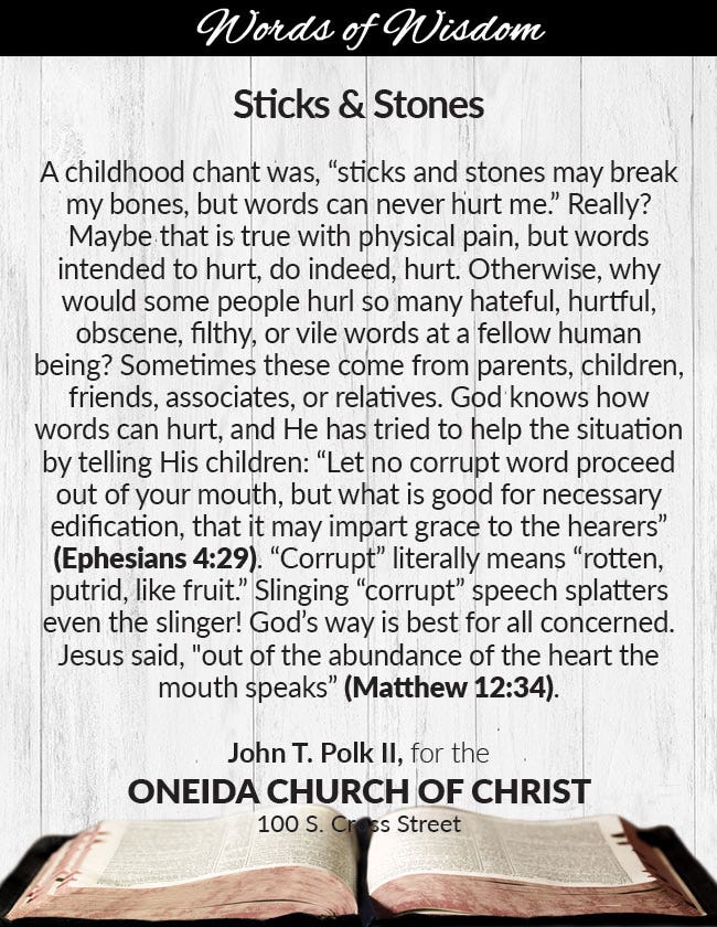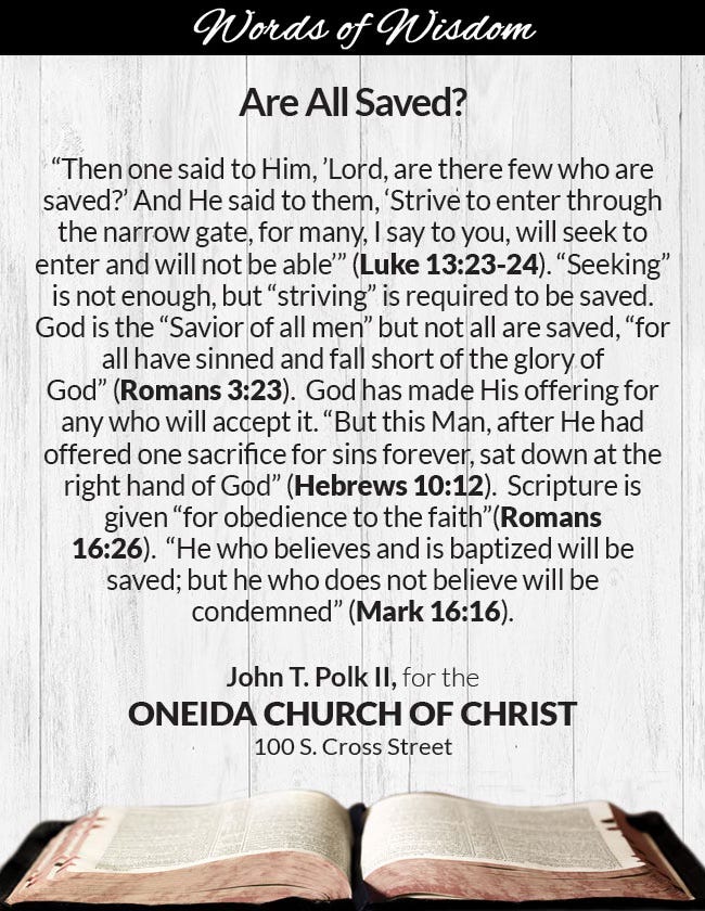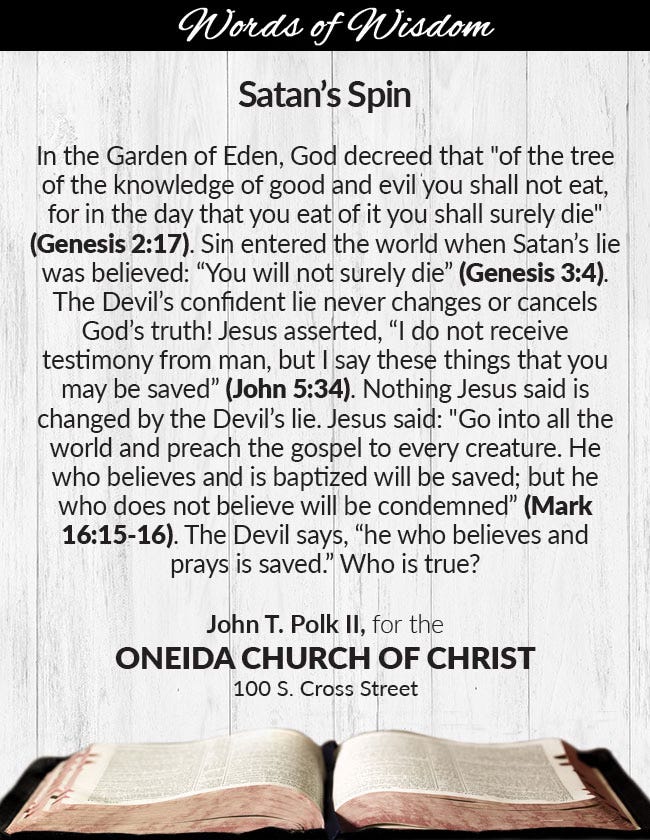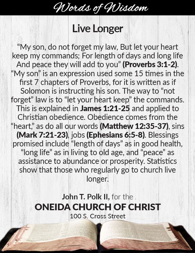 Words of Wisdom are presented by Preacher John T. Polk II, for the Oneida Church of Christ. The Church of Christ is located at 100 S. Cross Street in Oneida. Services at the Church of Christ include Sunday school at 10 a.m., Sunday morning worship at 11 a.m., Sunday evening worship at 6 p.m., and Wednesday Bible study at 7 p.m. Find more of Johnny Polk’s Words of Wisdom, commentaries, sermons and publications johntpolkII.com.