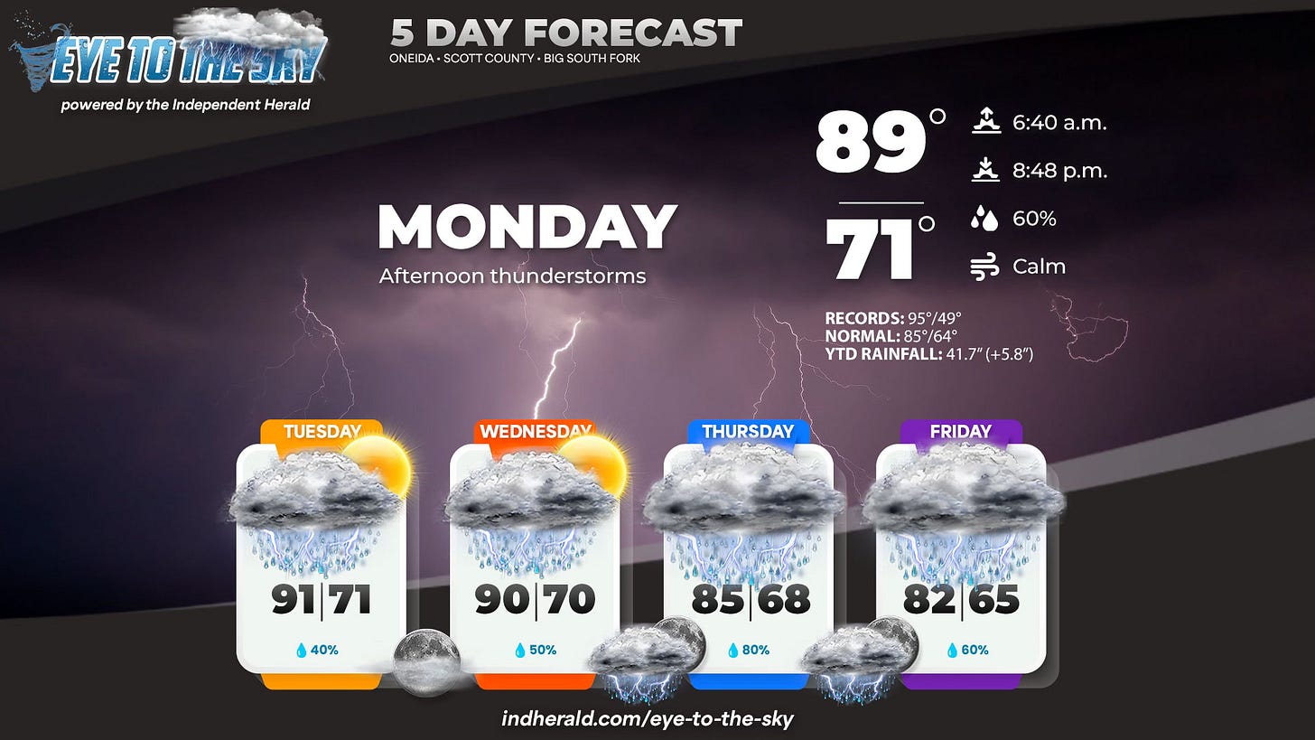 ⛈️ Weather: Thunderstorms are likely this afternoon as we begin a hot start to the week. Temps will be in the low 90s each day through Wednesday. But we should see cooler temperatures by the end of the week that will last through the weekend. Check out our daily Eye to the Sky updates on our Facebook page — published each morning at 7 a.m. on the dot — or always available at indherald.com.