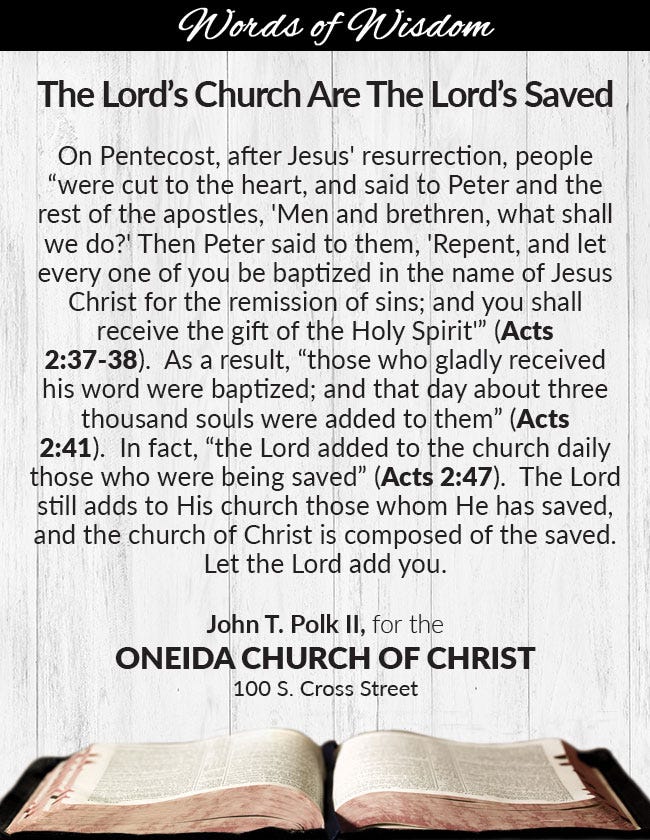 Words of Wisdom are presented by Preacher John T. Polk II, for the Oneida Church of Christ. The Church of Christ is located at 100 S. Cross Street in Oneida. Services at the Church of Christ include Sunday school at 10 a.m., Sunday morning worship at 11 a.m., Sunday evening worship at 6 p.m., and Wednesday Bible study at 7 p.m. Find more of Johnny Polk’s Words of Wisdom, commentaries, sermons and publications johntpolkII.com.